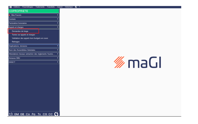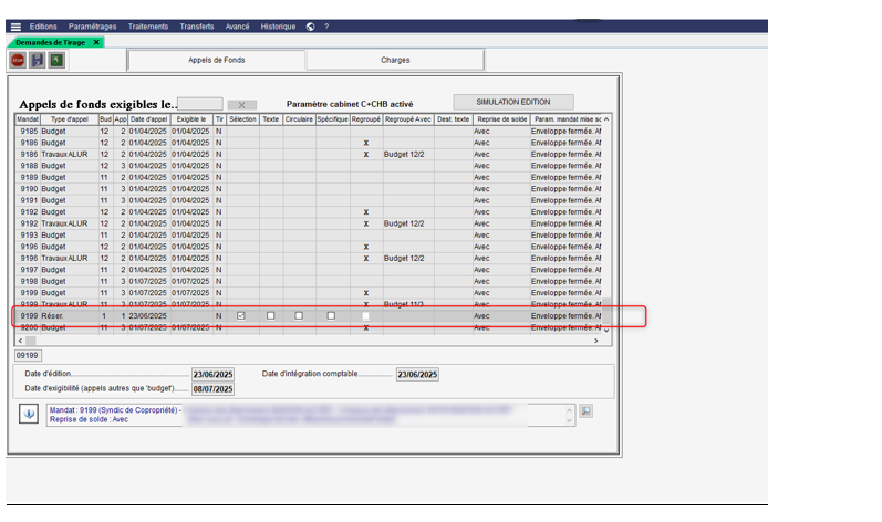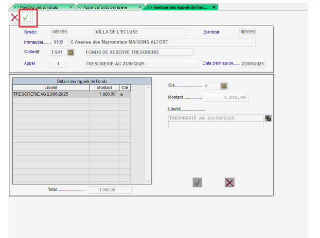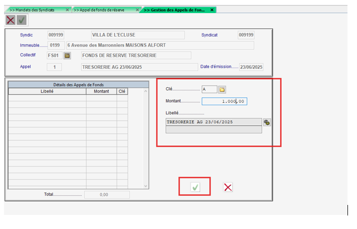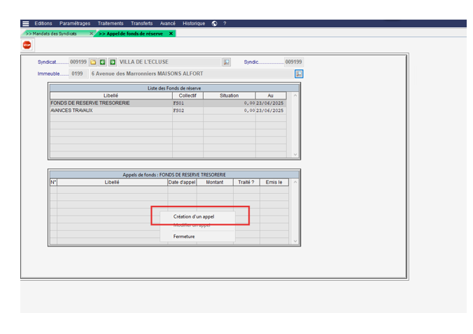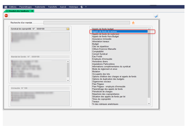 - Cliquer sur la tâche Appels de fonds de réserve à droite de l’écran après avoir sélectionner le mandat