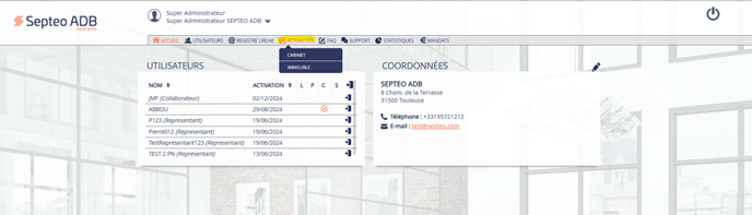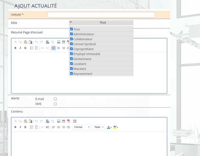 - Sur votre site Extranet , cliquer sur l’onglet « Actualités » et sélectionner si vous souhaitez que l’actualité soit pour le cabinet ou un immeuble en particulier.