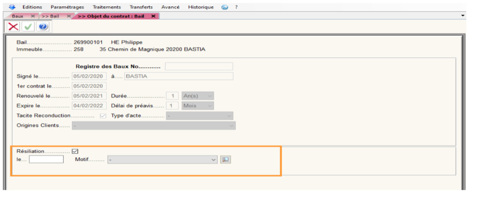 Le logiciel vous repositionnera alors dans la fenêtre « objet du contrat », vous avez à présent la main pour sélectionner la date de résiliation.