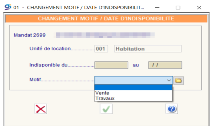 Lorsque vous sélectionnez le motif « Congés du locataire » vous avez la possibilité d’indiquer des dates d’indisponibilité qui vous permettrons de « bloquer la relocation » du bien. A cet effet, vous devez cliquer sur la loupe, pour permettre au système d’ouvrir l’écran de gestion des dates et le motif.