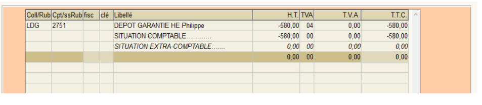 8. Lorsque vous valider l’en-tête de la facture, une ligne apparait dans le tableau de saisie relative au solde du compte locataire (collectif L) ainsi qu’une ligne relative au dépôt de garantie (LDG, ou LDGR)
