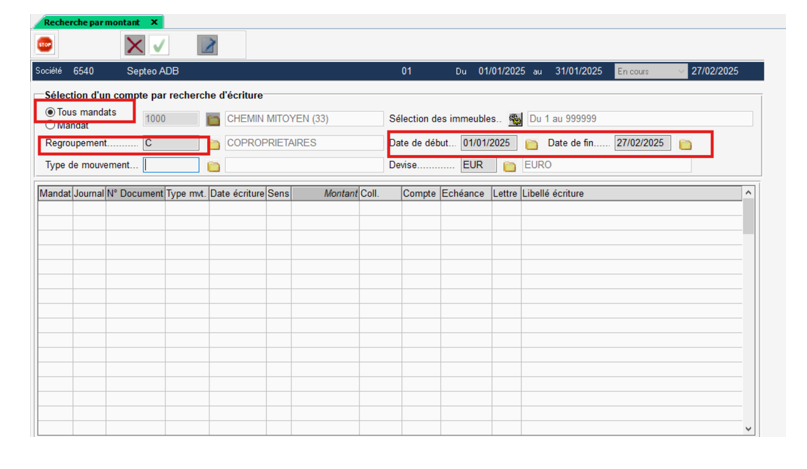 Il vous faut ensuite sélectionner tous les mandats le regroupement souhaité (C pour copropriétaires par exemple) et sélectionner les dates relatives. Puis cliquer sur Valider :