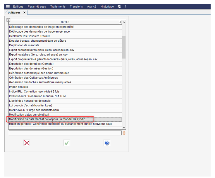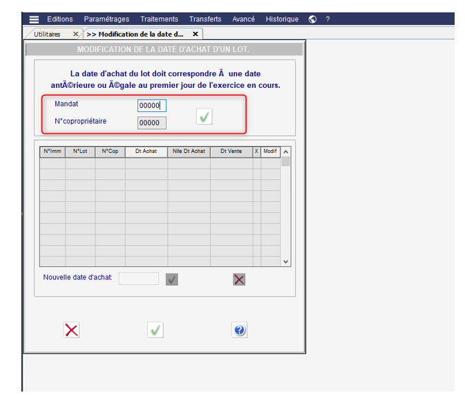 - Cliquer sur Modification de date d’achat de lot pour un mandat de syndic