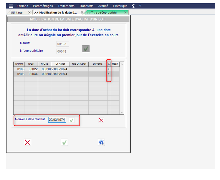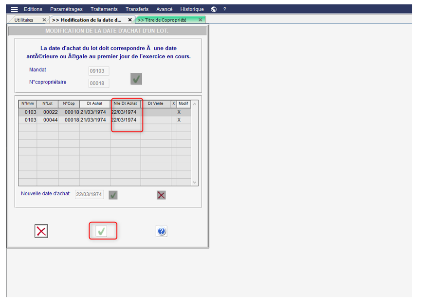 - Sélectionner les lots dont la date doit être modifiée puis indiquer la nouvelle date d’achat avant de valider