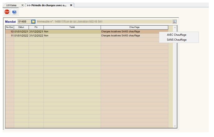 Le clic droit permet de modifier la nature des charges de chauffage ”avec ou sans” chauffage puis le changement s'effectue immédiatement
