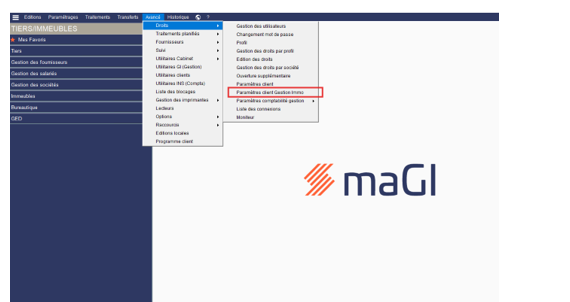 - Se rendre dans le Menu Avancé / Droit / Paramètres client Gestion Immo