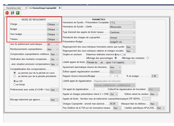 - Modifier le mode de règlement par défaut selon l’appel souhaité puis cliquer sur la disquette pour enregistrer