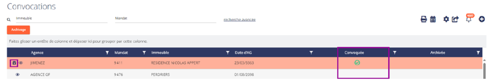 - Pour passer une convocation en non convoquée : appuyer sur l’icone calendrier présent à gauche