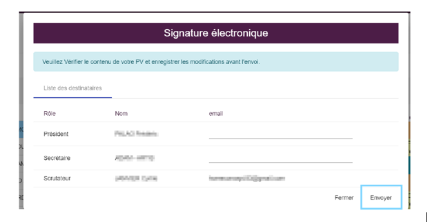 - Pour envoyer votre PV et/ou votre feuille de présence en signature électronique vous devez cliquer sur l’icône de signature.