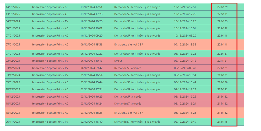 En cas de question précise sur un délai, une erreur… etc. il convient de communiquer le numéro dans la dernière colonne de droite (traitement) aux services de production à l’adresse : production-print@septeo.com