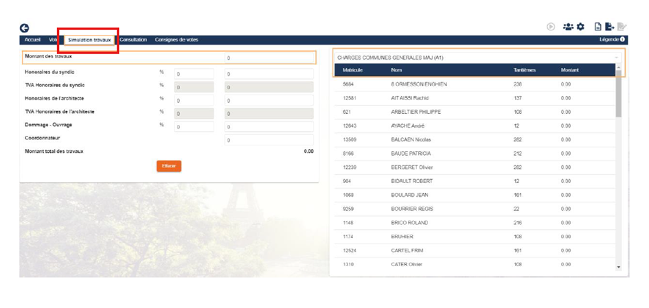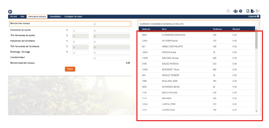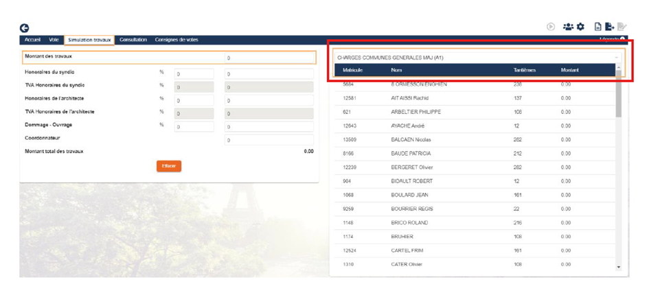 - Après avoir entré toutes les informations : Montant des travaux, honoraires syndic, TVA… etc : la liste des sommes demandées à chaque propriétaire est disponible.