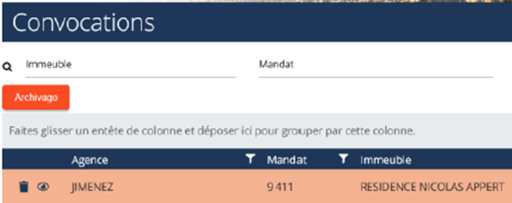 - Une fois la convocation archivée, la petite poubelle apparait pour la suppression.
