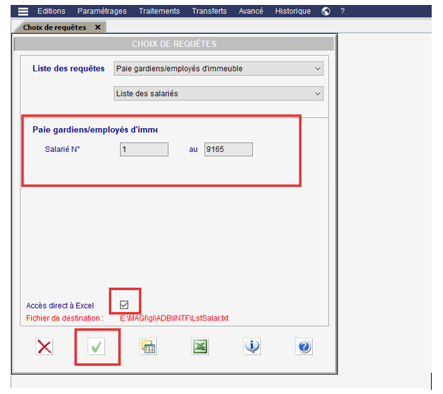 - Sélectionner les salariés désirés, cliquer sur accès direct à Excel puis sur valider