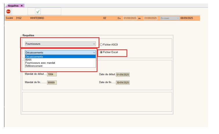 Depuis le Menu CC (ou CG) - Editions - Requêtes en sélectionnant Fournisseurs et Fichier Excel vous aurez accès aux éléments suivants sous format Excel :